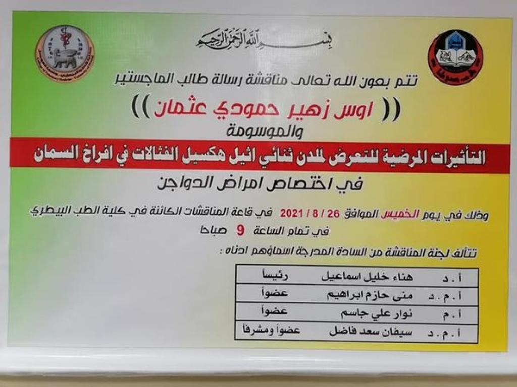 اجريت مناقشة طالب الماجستير (أوس زهير حمودي عثمان) في اختصاص (امراض دواجن) عن رسالته الموسومة ((التاثيرات المرضية للتعرض لملدن ثنائي اثيل هكسيل الفثالات في افراخ السمان))، يوم الخميس الموافق 26/8/2021 الساعة التاسعة صباحاً وعلى قاعة المناقشات في كليتنا.تألفت لجنة المناقشة من السادة المدرجة اسمائهم:1- أ.د. هناء خليل اسماعيل – جامعة الموصل/ كلية الطب البيطري – رئيساً.2- أ.م.د. منى حازم ابراهيم – جامعة الموصل/كلية الطب البيطري – عضواً.3- أ.م. نوار علي جاسم – جامعة تكريت/كلية الطب البيطري – عضواً.4- أ.م.د. سيفان سعد فاضل – جامعة الموصل/كلية الطب البيطري- مشرفاً.اذ هدفت دراسة الطالب الى دراسة التغيرات المرضية للرئة والدماغ والكبد والكلية مع الامعاء والقلب المجرعة بملدن ثنائي الاثيل هكسيل الفثالات لمدة اربعة وثمانية اسابيع, وتأثير هذا لملدن ثنائي الاثيل هكسيل الفثالات على انتاجية وخصوبة طيور السمان مع قياس تركيز لملدن ثنائي الاثيل هكسيل الفثالات ونتائجه الايضية في مصل الدم لمدة شهرين .ويعتبر ملدن ثنائي الاثيل هكسيل الفثالات اول مادة بلاستيكية تم تصنيعها لم تتحلل لحد الان وذات عمر نصف طويل بقدر 200 سنة ويدخل في الصناعات والمنتجات البلاستيكية مثل العلب الدوائية واللقاحية مما تشكل خطورة في التعرض المستمر لهذا الملدنوقد حضر السيد عميد الكلية الاستاذ الدكتور ظافر محمد عزيز ومعاون العميد الاستاذ الدكتور رعد عبد الغني السنجري ومجموعة من اساتذة الكلية جانب من العرض التقديمي للطالب…وقبلت رسالة الماجستير للطالب بتقدير #امتيازوالف الف مبارك للباحث والمشرف وللكلية هذا الموضوع المهم والانجاز العلمي وكل الموفقية للجنة المناقشة