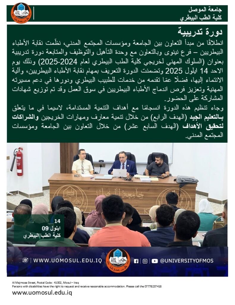 دورة تدريبية بعنوان (السلوك المهني لخريجي كلية الطب البيطري لعام 2024-2025)