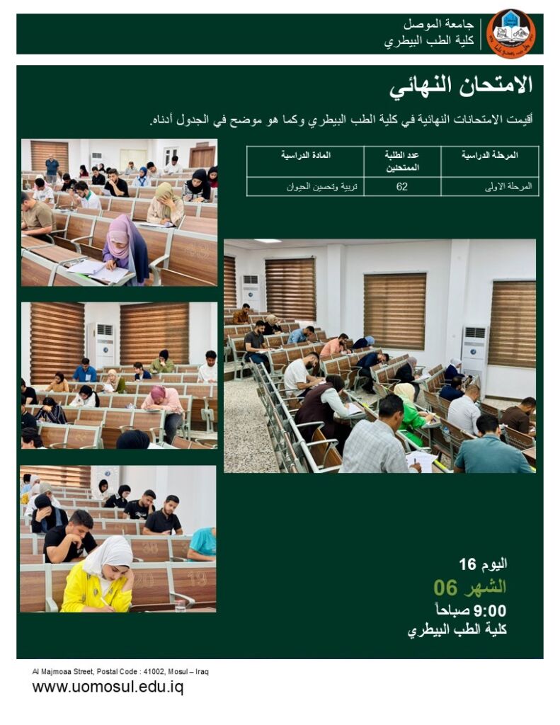 باشراف مباشر من قبل الاستاذ الدكتور رعد عبدالغني السنجري معاون العميد للشؤون العلمية بدأت اليوم الخميس 12 حزيران 2025 امتحانات الدراسات الاولية – المرحلة الاولى.