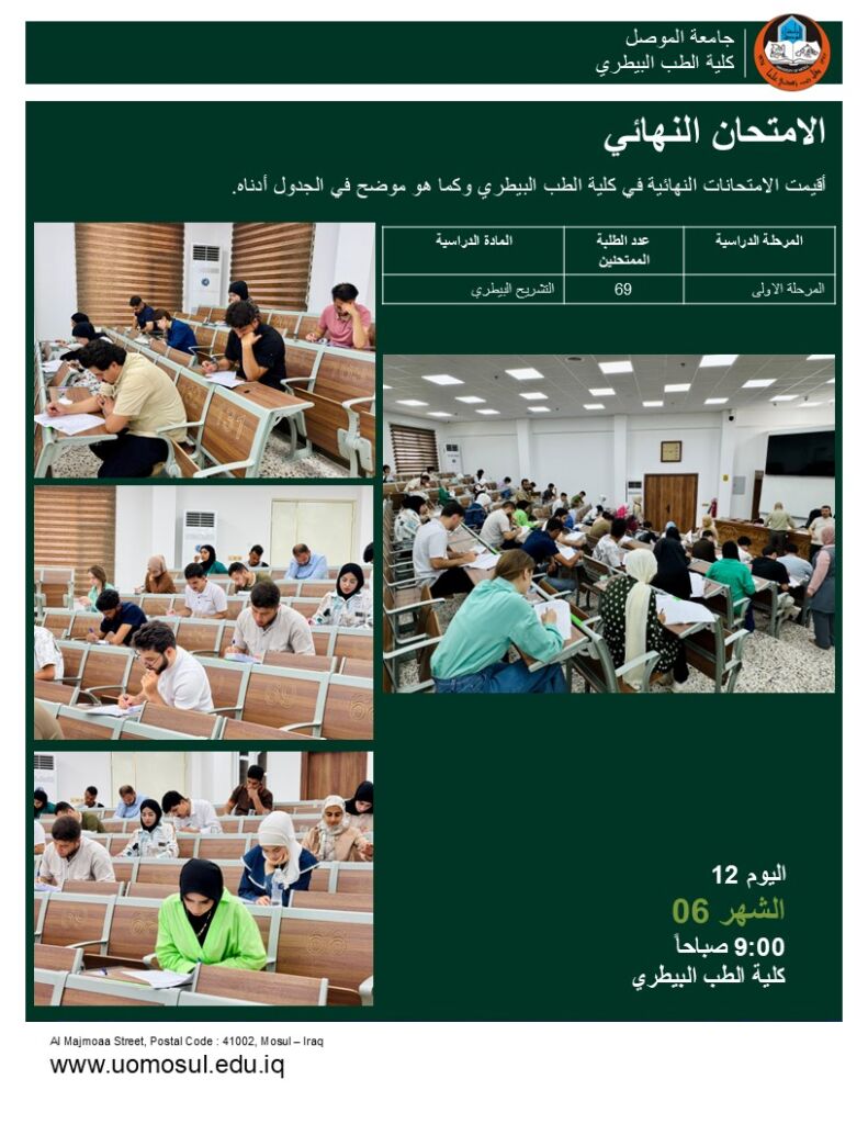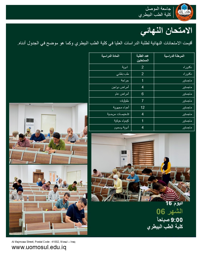 باشراف مباشر من قبل الاستاذ الدكتور سيڤان سعد المحمود عميد الكلية والاستاذ الدكتور رعد عبدالغني السنجري معاون العميد للشؤون العلمية بدأت اليوم الاثنين 16 حزيران 2025 الامتحانات النهائية لطلبة الدراسات العليا ومع استمرار امتحانات المرحلة الاولى.