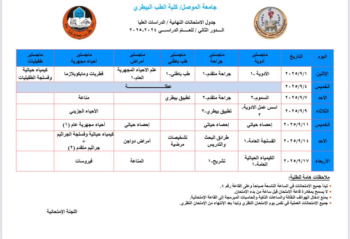 - يبدأ موعد التقديم للدراسات العليا في كلية الطب البيطري على الاختصاصات المختلفة المفتوحة يوم 15 / 5/ 2025 وينتهي التقديم بتاريخ 15/ 6/ 2025 كما موضح على موقع الوزارة.