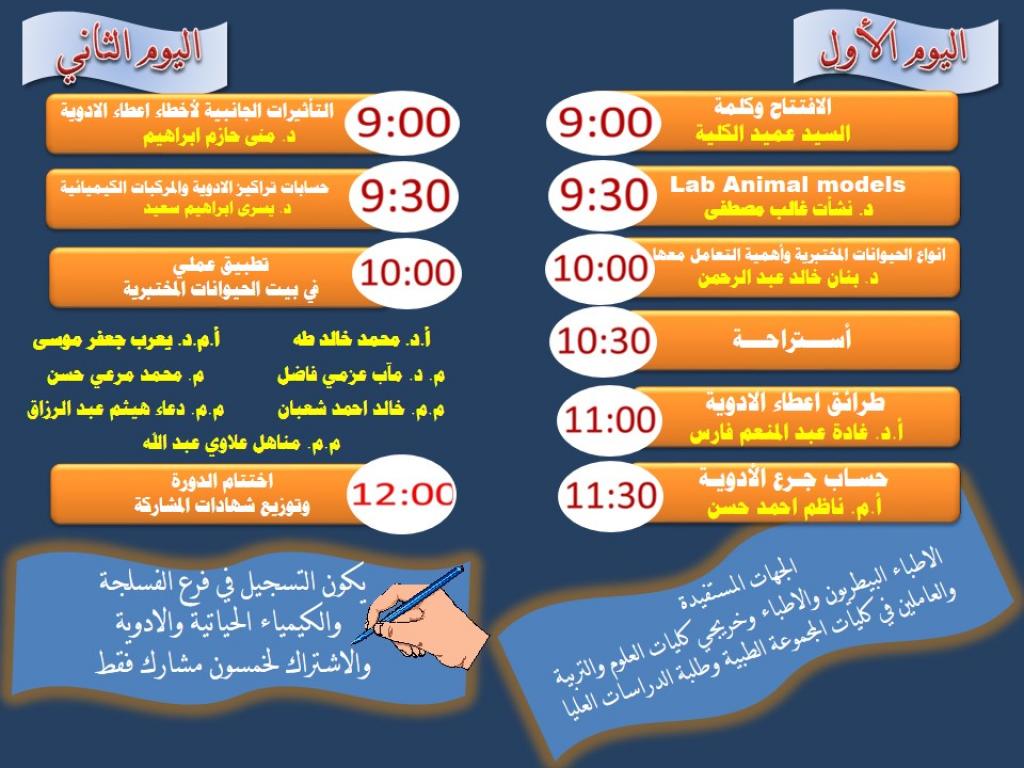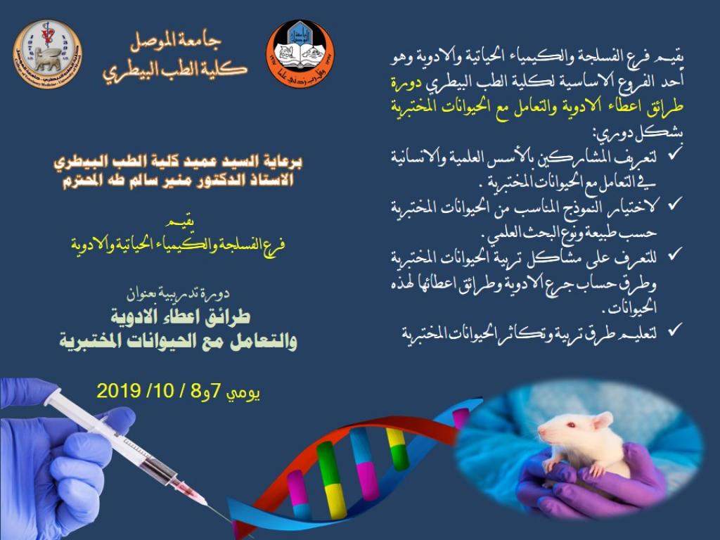 يسر كلية الطب البيطري / جامعة الموصل ان تعلن عن منهاج الدورة الاولى للعام الدراسي 2019/ 2020، والتي سوف تقام على رحاب قاعات كلية الطب البيطري للفترة من 07/ 10/ 2019 ولغاية 08/ 10 / 2019 والموسومة (طرائق اعطاء الادوية والتعامل مع الحيوانات المختبرية)