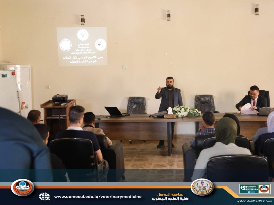 ١- الاستاذ الدكتور صفوان يوسف البارودي رئيس فرع الاحياء المجهرية بالقاء محاضرة بعنوان (اهم الامراض الفايروسية التي تصيب الدواجن في محافظة نينوى). تخللت المحاضرة جانب من النقاشات العلمية المستفيضة فضلا عن مناقشة اهم الامراض الفايروسية المنتشرة وسبل السيطرة عليها