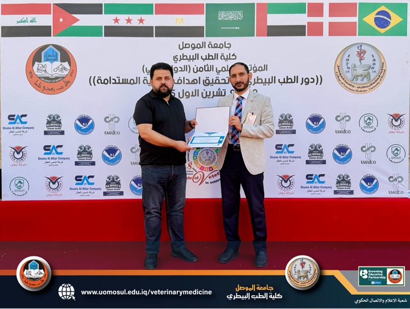 وفي ختام الفعالية، تم منح الشركات والمكاتب المشاركة شهادات تقديرية من قبل السيد عميد كلية الطب البيطري الأستاذ الدكتور سيڤان سعد المحمود تقديراً لجهودهم ومساهمتهم في إنجاح المؤتمر.