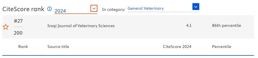 إنجاز جديد يضاف الى رصيد المجلة العراقية للعلوم البيطرية، إذ حصلت المجلة في التحديث السنوي الأخير للمستوعب العالمي سكوبس على المرتبة 27 عالميا في اختصاص الطب البيطري من ضمن 260 مجلة عالمية مصنفة ضمن مستوعب سكوبس، واستمر تصنيف المجلة العراقية للعلوم البيطرية في اختصاص الطب البيطري في الربع الأول للسنة الثانية على التوالي، كما صنفت المجلة للعام 2024 لأول مرة في اختصاص علوم الحيوان والعلوم الزراعية في الربع الأول وبالمرتبة 87 عالمياً من 509 مجلة عالمية مصنفة ضمن اختصاص علوم الحيوان والعلوم الزراعية وكانت أيضاً ضمن الربع الأول. أما فيما يخص معامل استشهاد المجلة فقد ارتفع من 3.4 لسنة 2023 الى 4.1 في سنة 2024.
