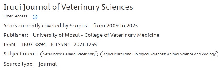 إنجاز جديد يضاف الى رصيد المجلة العراقية للعلوم البيطرية، إذ حصلت المجلة في التحديث السنوي الأخير للمستوعب العالمي سكوبس على المرتبة 27 عالميا في اختصاص الطب البيطري من ضمن 260 مجلة عالمية مصنفة ضمن مستوعب سكوبس، واستمر تصنيف المجلة العراقية للعلوم البيطرية في اختصاص الطب البيطري في الربع الأول للسنة الثانية على التوالي، كما صنفت المجلة للعام 2024 لأول مرة في اختصاص علوم الحيوان والعلوم الزراعية في الربع الأول وبالمرتبة 87 عالمياً من 509 مجلة عالمية مصنفة ضمن اختصاص علوم الحيوان والعلوم الزراعية وكانت أيضاً ضمن الربع الأول. أما فيما يخص معامل استشهاد المجلة فقد ارتفع من 3.4 لسنة 2023 الى 4.1 في سنة 2024.