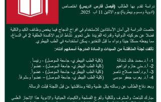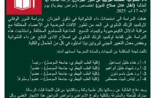 ناقشت كلية الطب البيطري جامعة الموصل رسالة الماجستير الموسومة: (دراسة الدور الوقائي لأوكسيد الزنك النانوي في الحد من تطور افات داء النشوانية المحدث تجريبياً في ذكور الجرذان). دراسة تقدمت بها الطالبة (أنفال عادل صلاح [إقرأ المزيد]
