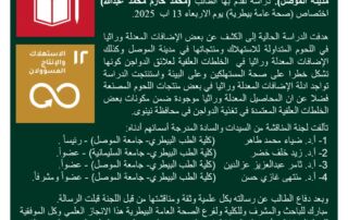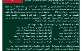 ناقشت كلية الطب البيطري جامعة الموصل رسالة الماجستير الموسومة: (الكشف عن الإضافات المعدلة وراثيأً في اللحوم وبعض منتجاتها في مدينة الموصل). دراسة تقدم بها الطالب (محمد حازم محمد عبدالله) اختصاص (صحة عامة بيطرية) يوم الاربعاء [إقرأ المزيد]