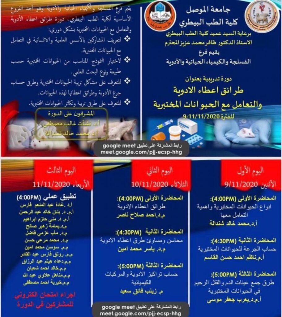 البيطري الاستاذ الدكتور ظافر محمد عزيز يسر كلية الطب البيطري / جامعة الموصل ان تعلن عن منهاج الندوة العلمية الاولى للعام الدراسي 2020 – 2021 والتي يقيمها فرع الصحة العامة البيطرية بالتعاون مع فرع الاحياء المجهرية والموسومة “دور الطب البيطري في مواجهة الجوائح التي تجتاح العالم” والتي سوف تقام عبر الفضاء الالكتروني من خلال منصة Google Meetيوم الاثنين المصادف 30 /11 /2020 الساعة الرابعة عصراًرابط المشاركة عن طريق تطبيق Meet:https://meet.google.com/uda-hzgm-szqعلماً بانه سيتم منح شهادة مشاركة وكتاب تأييد حضور للمشاركيين في الندوة العلمية .لتحميل دوار الندوة من هنا رابط الملف المرفق