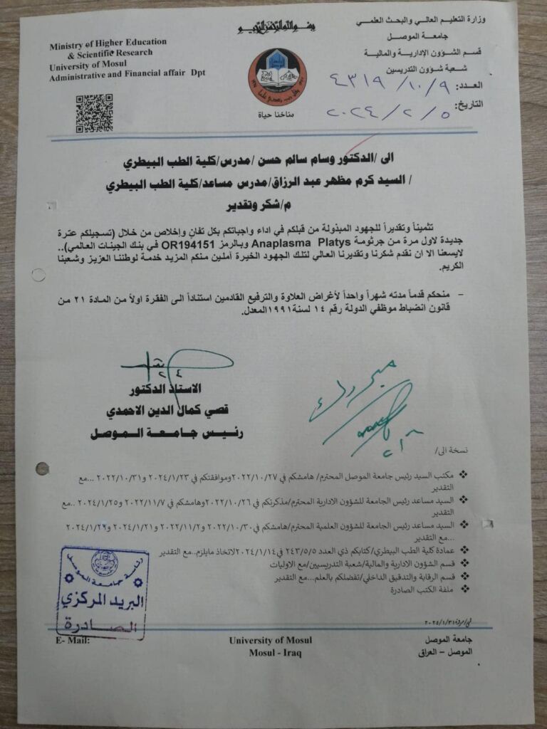 تتقدم عمادة كلية الطب البيطري / جامعة الموصل متمثلة بالسيد عميد الكلية الاستاذ الدكتور ظافر محمد عزيز ونيابة عن منتسبي الكلية بالتعزية والمواساة الى دكتورة أصيل محمد صالح رحاوي / تدريسية في فرع الامراض لوفاة والدها.