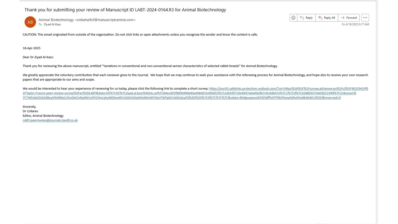 2- الأستاذ المساعد الدكتور زياد مكرم يوسف (فرع الجراحة وعلم تناسل الحيوان) بحثاً علمياً لمجلة Animal Biotechnology وهي من المجلات العلمية العالمية التي تندرج ضمن مستوعبات سكوبس وتقع في الربع الثاني ولها معامل اقتباس 2,9.