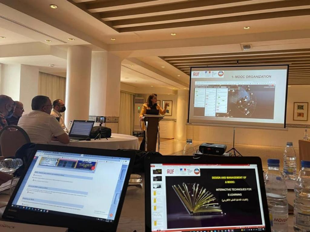 تتلخص دورة ال Mooc= Massive open online courseبالتعريف بالمصادر المفتوحة والبرمجيات المستخدمة والتي يمكن للتدريسي والطالب الاستفادة منها وحول الية تصميم المساقات الهائلة مفتوحة المصدر وادارتها عبر تصميم موقع ودروس تعليمية بتعاون الاستاذة مع بعضهم ، والتي تم اعطاؤها من قبل اساتذة متخصصين في مجال التعليم الالكتروني،وفي نهاية الدورة ، تم التقسيم الى عدة كروبات حيث تميز الفريق المشارك بالتحليل المتميز لاجزاء الدورة بطريقة مسهبة اشادت به اللجنة و كان الفريق من تخصصات مختلفة ( استاذات من كليات مختلفة) وقدم Mooc بعنوان**Interactive techniques of E-Learning**