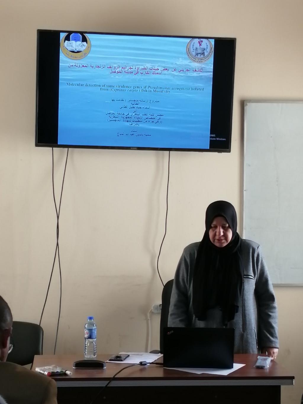 ? كما ألقت طالبة الماجستير اسماء جياد حلقة دراسية عن مشروع بحثها الموسوم ((الكشف الجزيئي عن بعض عوامل الضراوة للزوائف الزنجارية المعزولة من اسماك الكارب في مدينة الموصل )) حيث تهدف الدراسة الى تسليط الضوء على أهمية الزوائف الزنجارية وما تسببه من امراض في الأسماك بالعراق، ولقلة الدراسات الجزيئية المتعلقة بعوامل ضراوة هذه الجراثيم ولكونها من الجراثيم المنقولة بالماء والغذاء ولما تشكله من خطر على صحة المستهلكين لذا كان الغرض من هذه الدراسة.