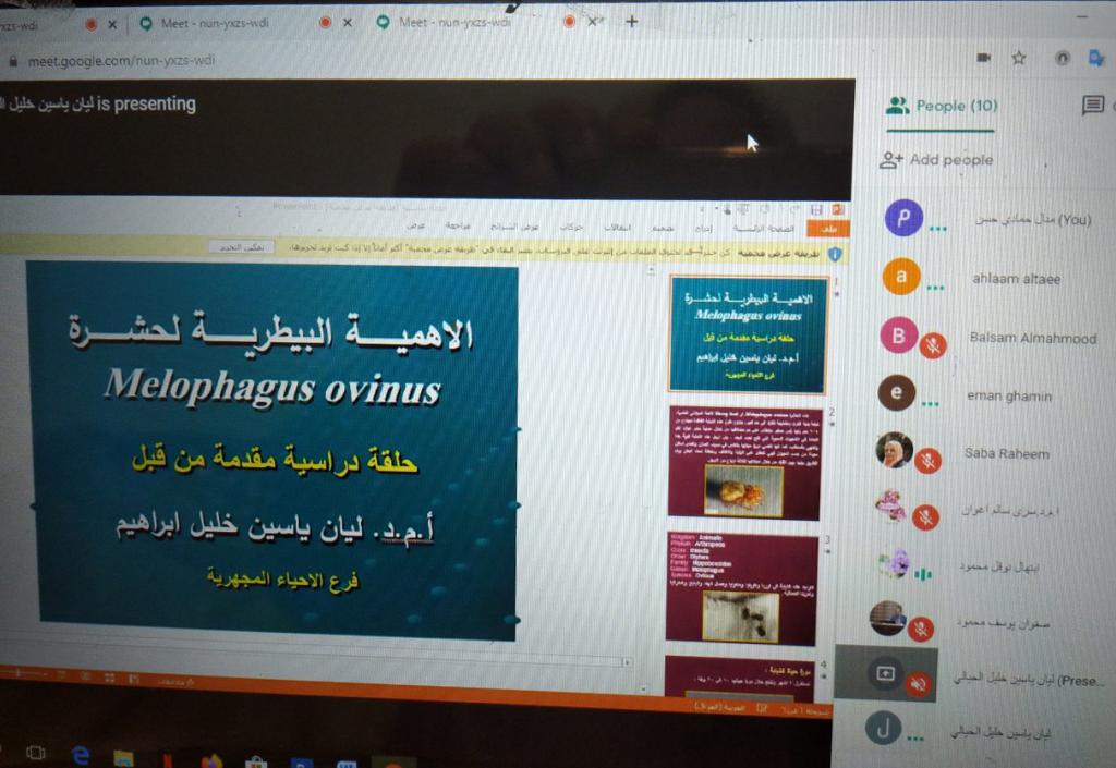 ضمن النشاطات العلمية لفرع الاحياء المجهرية القت أ.م.د. ليان ياسين خليل حلقة دراسية عبر الفضاء الالكتروني وبحضور عدد من تدريسي الفرع والكلية يوم الخميس الموافق 14 / 5 / 2020 بعنوان ” الاهمية البيطرية لحشرة Melophagus ovinus”.وقد تناولت الحلقة شرح مفصل عن “لاكعة المواشي الغنمية”وهي من الحشرات ثنائية الأجنحة تتغذى على دم مضائفها وهي تشبة القراد من الناحية الشكلية واسمها العلمي Melophagus ovinus وتعود لعائلة Hippoboscidae.