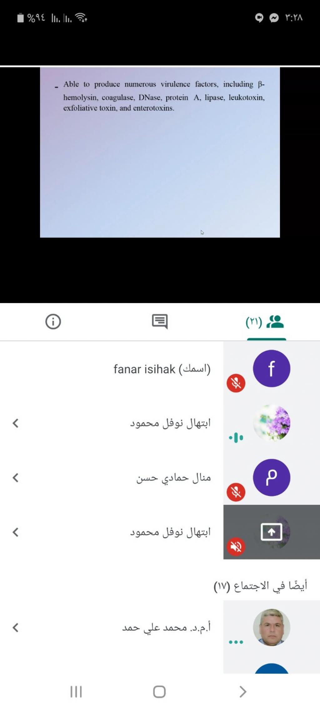 ضمن النشاطات العلمية لفرع الاحياء المجهرية في كلية الطب البيطري القت م. ابتهال نوفل محمود حلقة دراسية عبر الفضاء الالكتروني وبمشاركة عدد من تدريسي الفرع يوم الخميس الموافق 30 / نيسان / 2020، بعنوان”Coagulase – Positive Staphylococci”تناولت هذه الحلقة الاشارة الى المكورات العنقودية واسعة الانتشار، اذ تتواجد عادة على سطح الجلد للانسان والحيوان، وقد سجل لحد الان تسعة انواع موجبة لاختبار التجلط، وهي تمتلك عوامل ضراوة تمكنها من احداث الامراضية في المضيف. تتفاقم الاصابة بهذه الجراثيم من خلال ظهور سلالات مقاومة للمضادات وخاصة مجموعة البيتا لاكتم.