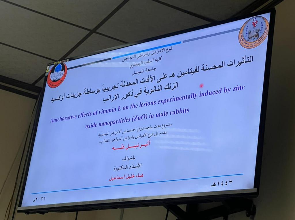 القى طالب الدراسات العليا ( أثير نبيل طه) في فرع الامراض وامراض الدواجن يوم الأربعاء 6 /4 / 2022 حلقة دراسية حول موضوع بحثه الموسوم:((التأثيرات المحسنة لفيتامين هـ على الآفات المحدثة تجريبياً بوساطة جزيئات أوكسيد الزنك النانوية في ذكور الارانب)). وتطرق الطالب الدراسات بالتكلم عن المقدمة لبحثه والمواد وطرائق العمل واهم النتائج التي توصل اليها وباشراف الأستاذ الدكتورة هناء خليل اسماعيل.وتمت مناقشة النتائج بحضور رئيس الفرع الأستاذ الدكتور هناء خليل إسماعيل ونخبة من السادة تدريسي الفرع الموقرين وطلبة الدراسات العليا الماجستير . وقدم السادة التدريسيين مقترحاتهم وآرائهم التي تصب في الارتقاء العلمي بالبحث المقدم.#عمادة_كلية_الطب_البيطري#فرع_الامراض_امراض_الدواجن#اساتذتنا_فخرنا#طلبتنا_املنا