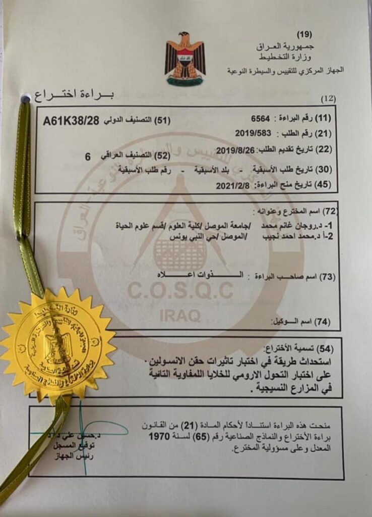براءة اختراع لاستاذ رائد في كلية الطب البيطري