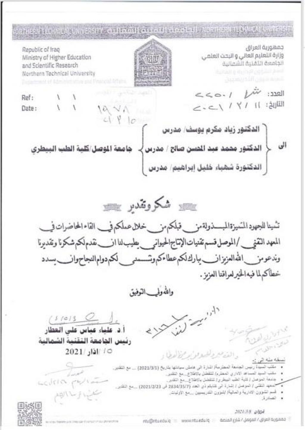 قدمت الاستاذ الدكتور علياء عباس علي العطار/ رئيس الجامعة التقنية الشمالية كتاب شكر وتقدير الى كل من:د.زياد مكرمد.محمد عبد المحسند. شهباء خليللتعاونهم ومساهمتهم في اعطاء المحاضرات في المعهد التقني وذلك ضمن التعاون بين جامعة الموصل والجامعة التقنية الشمالية.كل الموفقية لاساتذة كليتنا والشكر موصول لرئيس الجامعة التقنية لهذه الالتفاتة الجميلة.