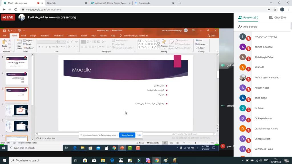 شارك عدد من التدريسيين في كلية الطب البيطري في ورشة العمل التي اقامها مركز الحاسبة الالكتروني في جامعة الموصل عصر اليوم الاحد الموافق ٥ / ٤ / ٢٠٢٠، وباستخدام تطبيق Meet، وهو احد تطبيقات G Suite.تضمنت الورشة مقدمة عن استخدام برنامج Moodl من خلال محاضرة القاها الدكتور محمد عبد الغني، ثم محاضرة تعريفية عن اهم تطبيقات G Suite الاخرى تكلم عنها الدكتور عمر الزيدي، ومحاضرة اخيرة للدكتور شامل الامين تكلم فيها بصورة مفصلة عن تطبيق Google classroom، وقد شهدت الورشة مداخلات واستشارات عدة من عدد من تدريسي الكلية والجامعة، وقد تفضل الأساتذة من مركز الحاسبة مشكورين بالإجابة عن هذه الأسئلة والاستفسارات، كما شهدت الورشة مداخلة من السيد مساعد رئيس الجامعة للشؤون العلمية الاستاذ الدكتور منير سالم طه والذي تكلم فيها عن اهم الأمور المستخدمة في التعليم الالكتروني.