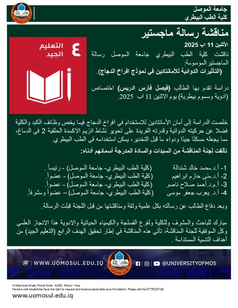 مبارك للباحثة والمشرفة وللكلية ولفرع الاحياء المجهرية هذا الانجاز العلمي وكل الموفقية للجنة المناقشة، تأتي هذه المناقشة في إطار تحقيق الهدف الرابع (التعليم الجيد) من أهداف التنمية المستدامة .