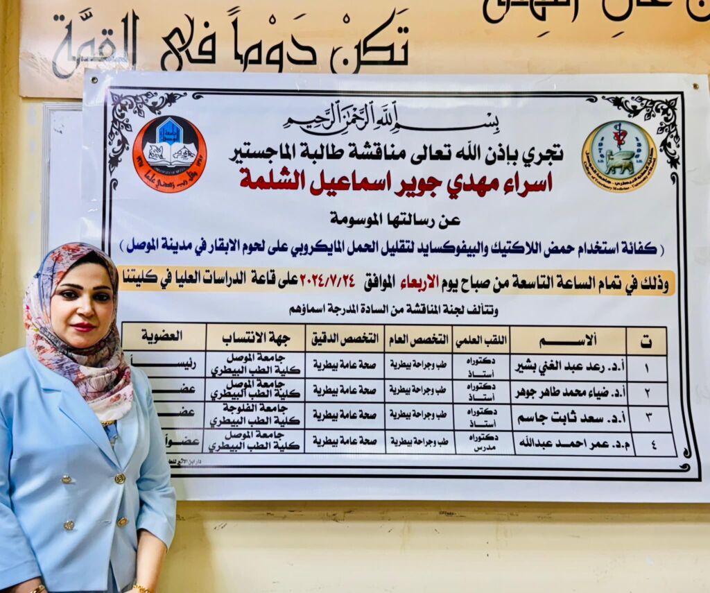 مبارك للباحث والمشرفة وللكلية ولفرع الصحة العامة البيطرية هذا الإنجاز العلمي وكل الموفقية للجنة المناقشة