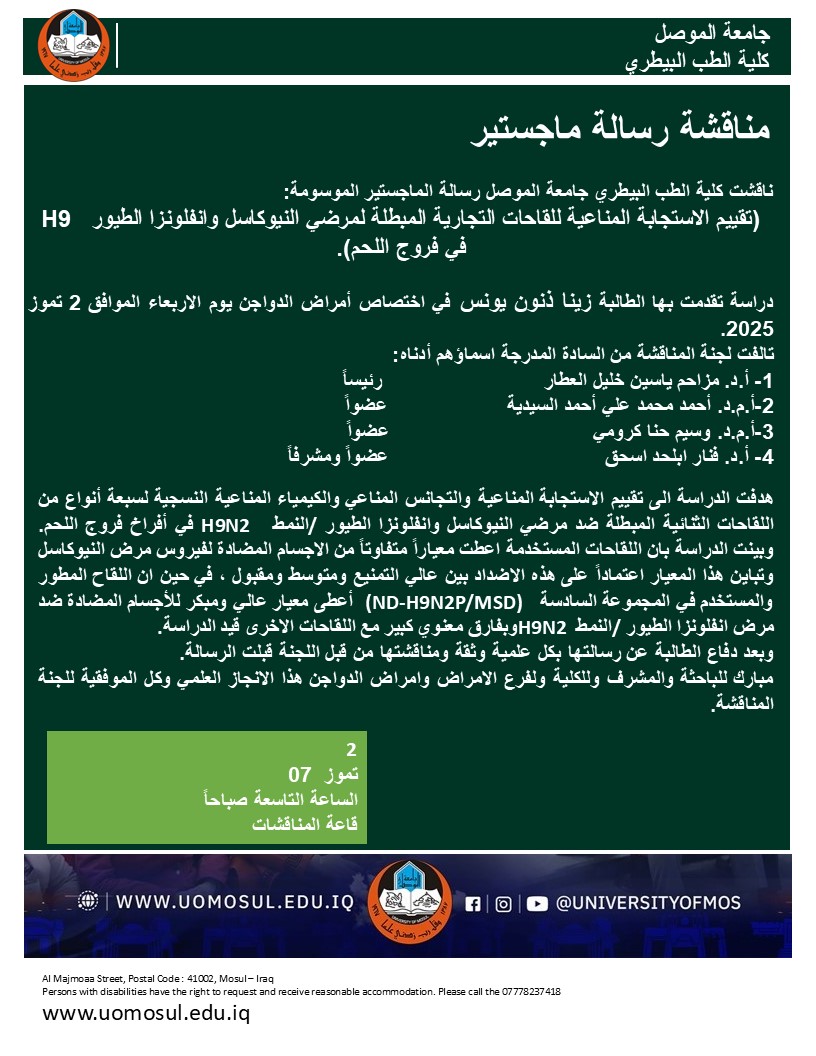 دراسة تقدمت بها الطالبة زينا ذنون يونس في اختصاص أمراض الدواجن يوم الاربعاء الموافق 2 تموز 2025.