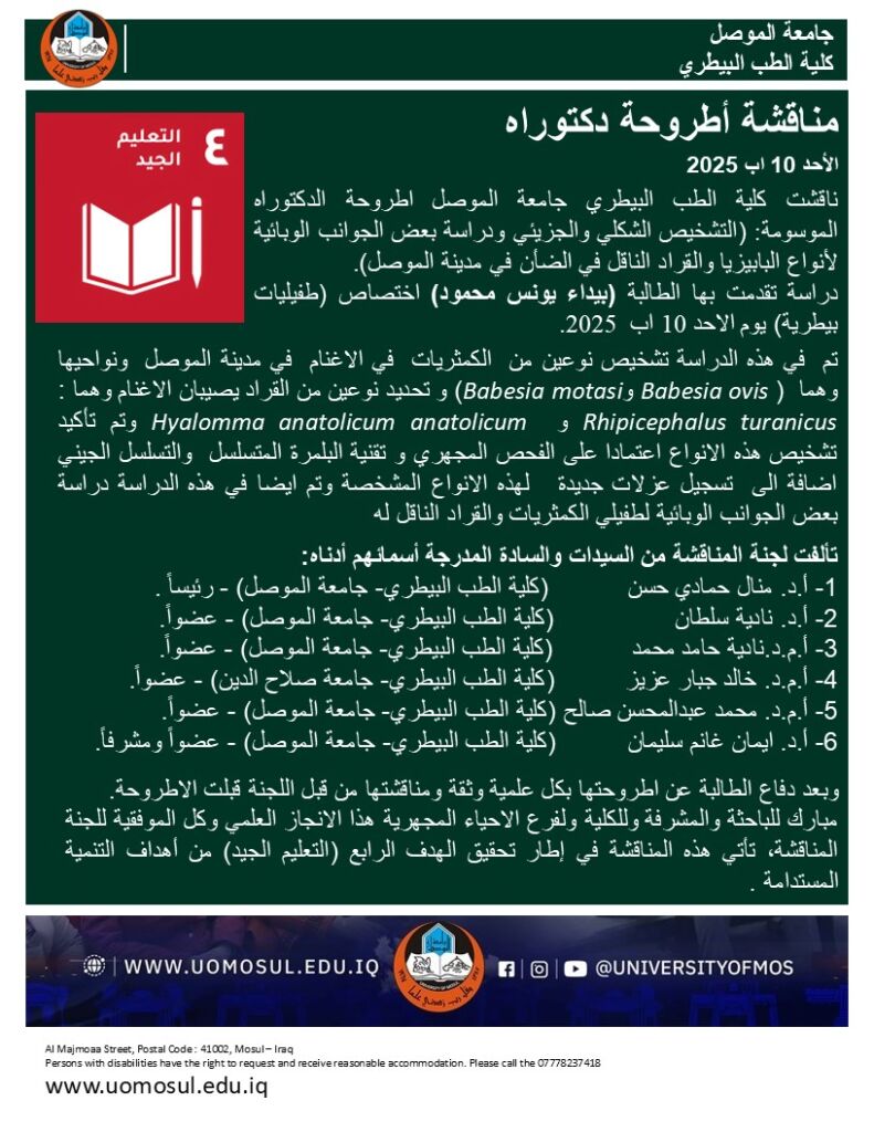 ناقشت كلية الطب البيطري جامعة الموصل رسالة الماجستير الموسومة: