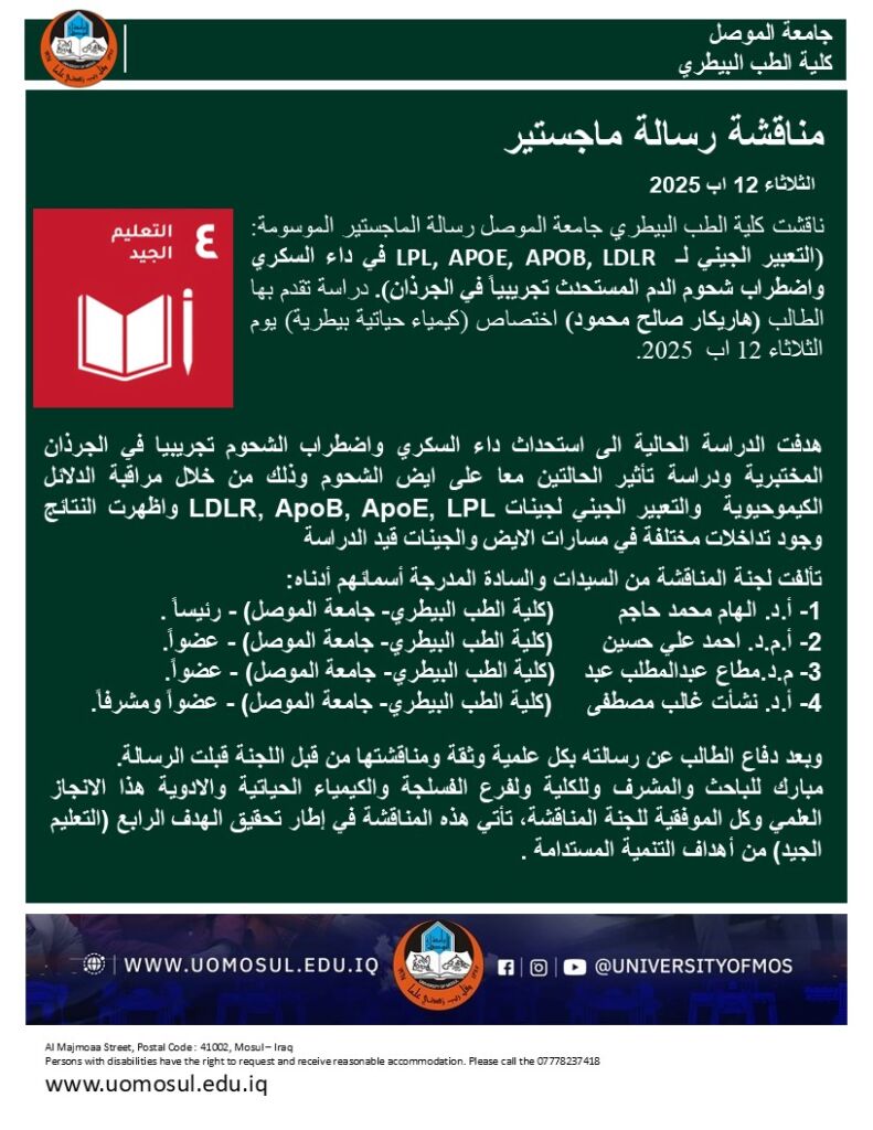 ناقشت كلية الطب البيطري جامعة الموصل رسالة الماجستير الموسومة: (الكشف عن الإضافات المعدلة وراثيأً في اللحوم وبعض منتجاتها في مدينة الموصل). دراسة تقدم بها الطالب (محمد حازم محمد عبدالله) اختصاص (صحة عامة بيطرية) يوم الاربعاء 13 اب 2025.