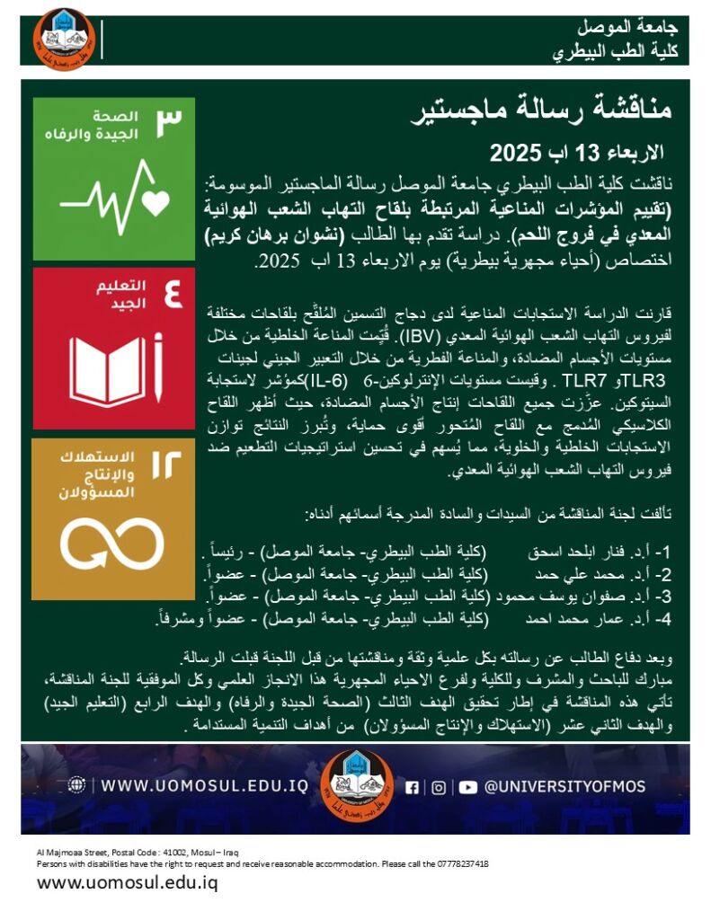 مبارك للباحثة والمشرفة وللكلية ولفرع الأمراض وأمراض الدواجن هذا الانجاز العلمي وكل الموفقية للجنة المناقشة، تأتي هذه المناقشة في إطار تحقيق الهدف الرابع (التعليم الجيد) من أهداف التنمية المستدامة .
