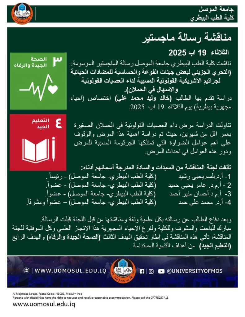 دراسة تقدم بها الطالب (عبدالسلام محمد صالح) اختصاص (ادوية وسموم بيطرية) يوم الاربعاء 20 اب 2025.