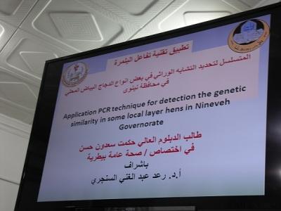 جرت مناقشة تقرير طالب الدبلوم العاليحكمت سعدون حسن ابراهيم اختصاص (الصحة العامة البيطرية) يوم الاربعاء المصادف29/1/2014 والموسوم (تطبيق تقنية البلمرة المتسلسل لتحديد التشابه الوراثي في بعض انواع الدجاج المحلي البياض في محافظة نينوى )، وتألفت لجنة المناقشة من السادة الاستاذ المساعد الدكتور نشأت غالب مصطفى (استاذ مساعد – كلية طب البيطري/ جامعة الموصل) رئيساً، والاستاذ المساعد الدكتورثامر عبد العزيز عزالدين (استاذ مساعد – كلية الطب البيطري / جامعة الموصل) عضواً، و الاستاذ الدكتور رعد عبد الغني السنجري ( استاذ – كلية الطب البيطري / جامعة الموصل) عضواً ومشرفاً، وبعد مناقشة مستفيضة قبل التقرير ومنح الطالب تقدير نهائي جيد