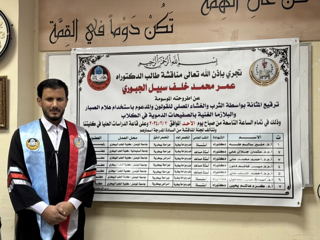 ضمن نشاطات فرع الامراض وامراض الدواجن شارك رئيس الفرع متمثلة بالاستاذ الدكتور كرم هاشم الملاح عضوا ومشرفا في رسالة الماجستير في كلية طب الاسنان عن دراسة التأثير السمي لخلات الزنك على الغدد اللعابية واللسان والكبد والكلية و الموسومة: ( التأثيرات السامة تحت الحادة لخلات الزنك على الأنسجة الرخوة الفموية وبعض الأعضاء في الجرذان ) وذلك يوم الأحد الموافق ٣ اذار ٢٠٢٤.