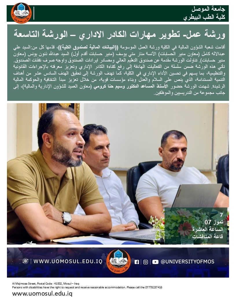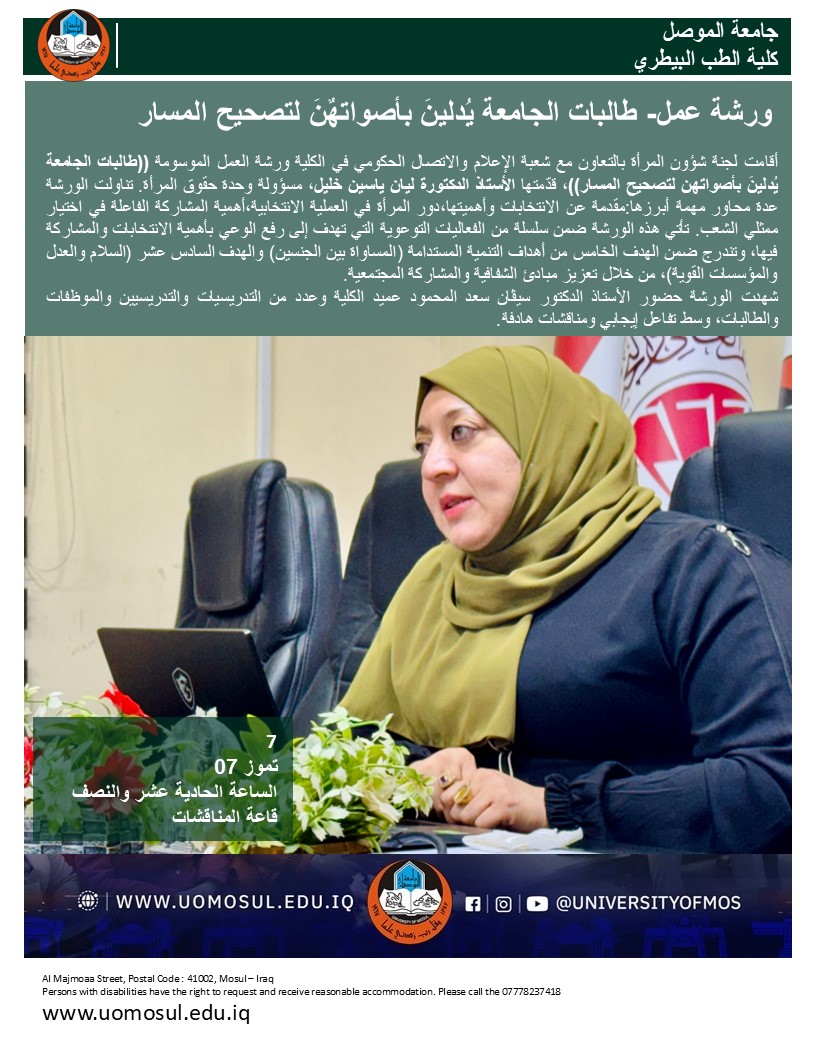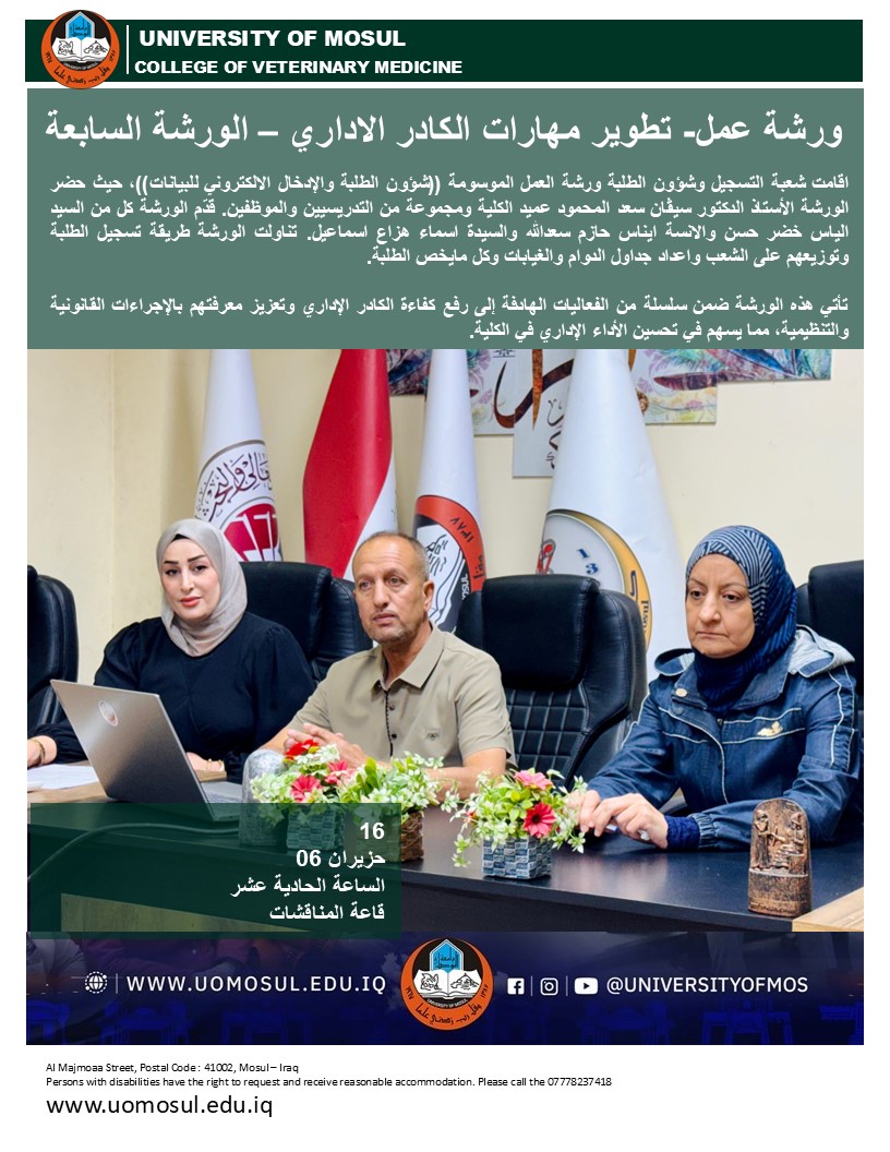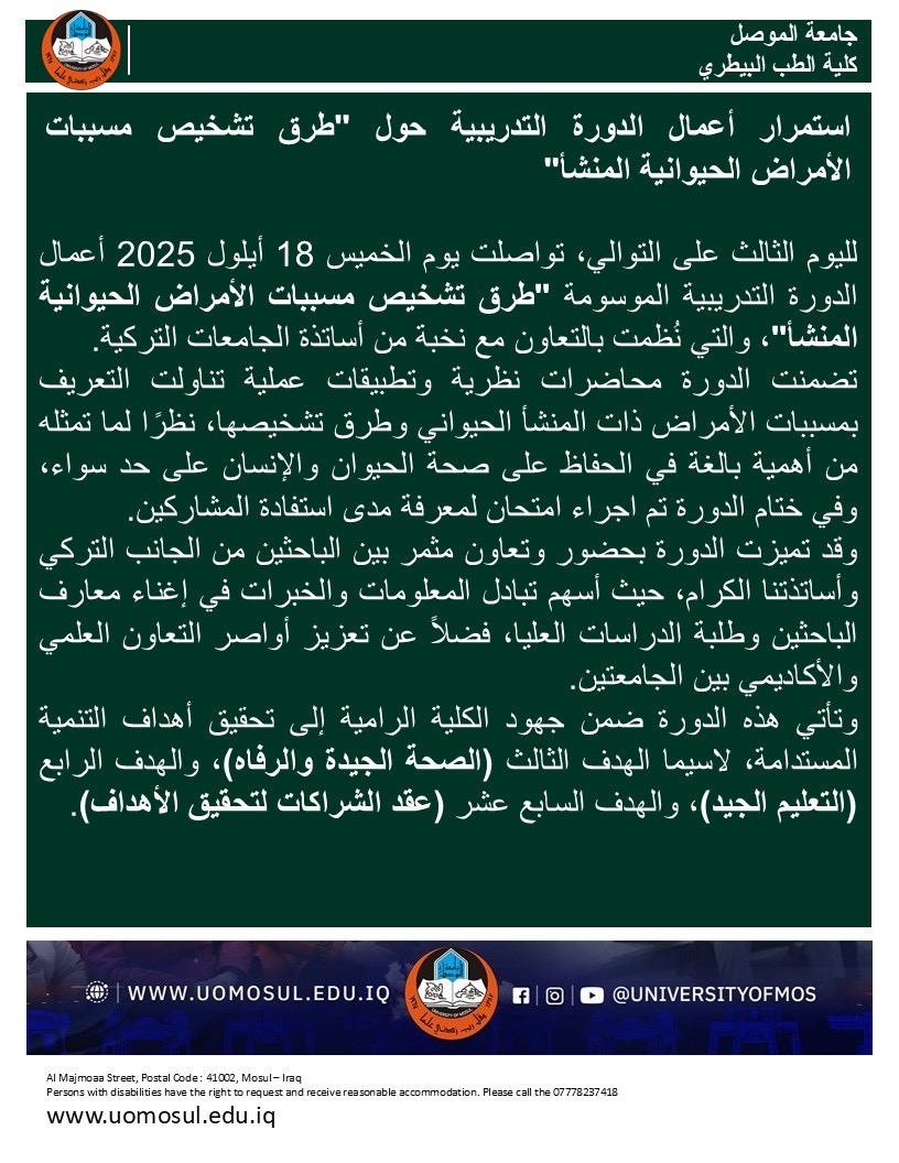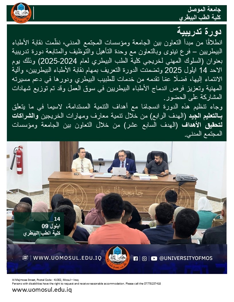 برعاية عمادة كلية الطب البيطري في جامعة الموصل، المتمثلة بالسيد العميد الأستاذ الدكتور ظافر محمد عزيز، وبحضور الدكتور عمر قصي، مسؤول شعبة التأهيل والتوظيف والمتابعة [إقرأ المزيد]