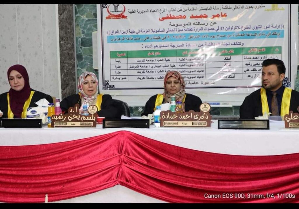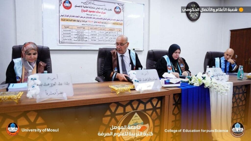 ترأس الاستاذ الدكتور نشأت غالب مصطفى (تدريسي في فرع الفسلجة والكيمياء الحياتية والادوية) لجنة مناقشة رسالة ماجستير في كلية العلوم البيئية للطالبة (سارة مزيد علي لطيف الطائي )عن رسالتها الموسومة