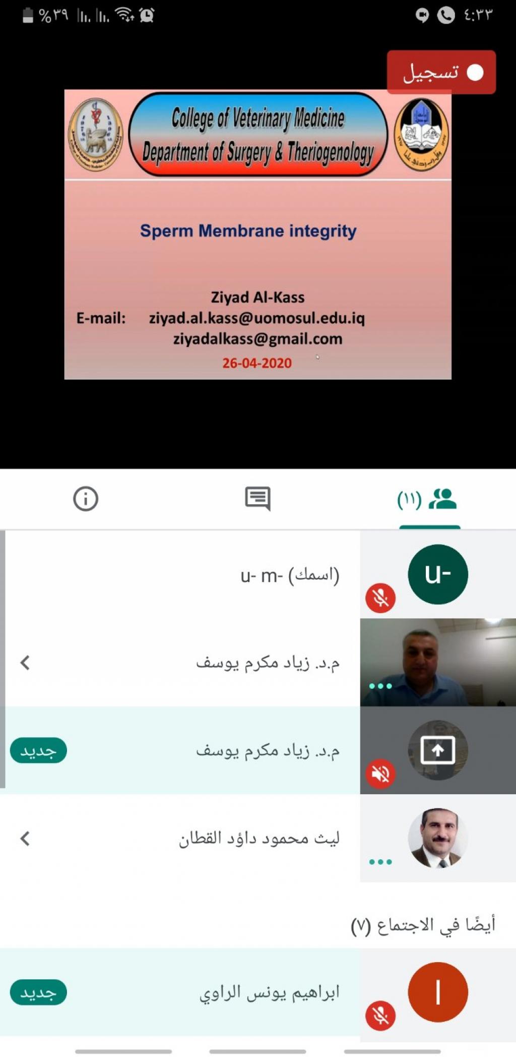 ضمن النشاطات العلمية لفرع الجراحة وعلم تناسل الحيوان القى الدكتور زياد مكرم يوسف حلقة دراسية افتراضية عبر الفضاء الالكتروني بعنوان “Sperm Membrane integrity” يوم الاحد الموافق 26 / نيسان / 2020،