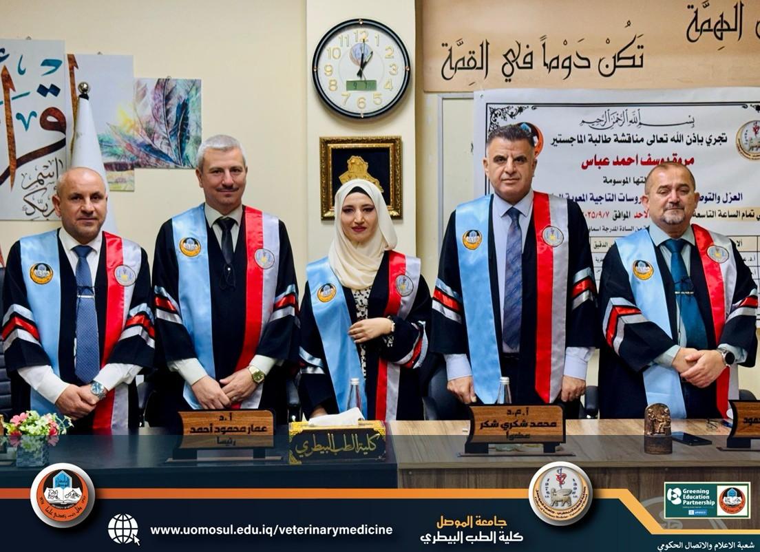 veterinarymedicine2025-09-07T14:04:29+03:00مناقشة رسالة ماجستير في كلية الطب البيطري فرع الاحياء المجهرية بعنوان (العزل والتوصيف الجيني للفايروسات التاجية المعوية الكبية) للطالبة (مروة يوسف احمد عباس) وبأشراف (أ.د. صفوان يوسف محمود) يوم الاحد 7 أيلول 2025. تألفت لجنة المناقشة من السادة المدرجة أسمائهم أدناه: 1- أ.د.عمار محمود احمد (كلية الطب البيطري- جامعة الموصل) - رئيساً . 2- أ.م.د. محمد شكري شكر (كلية الطب البيطري- جامعة دهوك) - عضواً. 3- أ.م.د. سلام عبد اسماعيل (كلية الطب البيطري- جامعة الموصل) - عضواً. 4- أ.د. صفوان يوسف محمود (كلية الطب البيطري- جامعة الموصل) – عضواً ومشرفاً. هدفت هذه الدراسة إلى عزل وتشخيص فيروس التاجي المعوي الكلبي لدى [إقرأ المزيد]