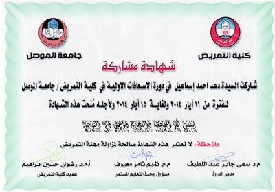 شاركت السيدة دعد احمد اسماعيل في دورة الاسعافات الاولية التي اقامتها كلية التمريض/ جامعة الموصل للمدة من 11-15/05/2014، وتم التعرف خلال الدورة على الطرق الصحيحة المتبعة في الاسعافات الاولية للشخص المصاب نتيجة مرض مفاجئ او اصابة خارجية مفاجئة لحين الوصول الى المستشفى، وكذلك تناولت الدورة عدة مواضيع مهمة منها اسعاف الكسور والحروق والنزيف والجروح والتسمم ولدغات الحشرات بانواعها