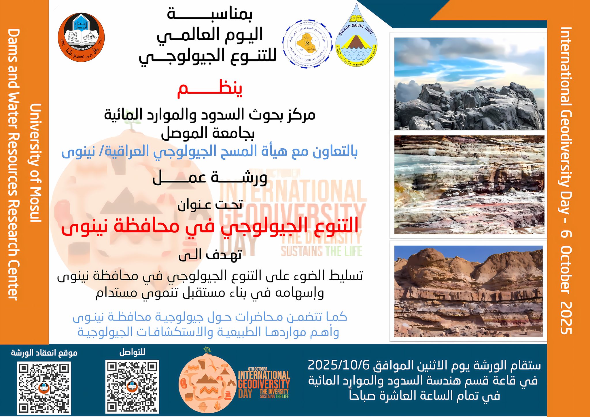نظم مركز بحوث السدود والموارد المائية بالتعاون مع هيأة المسح الجيولوجي العراقية/ مكتب نينوى ورشة عمل بعنوان "التنوع الجيولوجي في محافظة نينوى"، وذلك يوم الاثنين 6 تشرين الأول 2025 في قاعة قسم هندسة السدود والموارد [إقرأ المزيد]