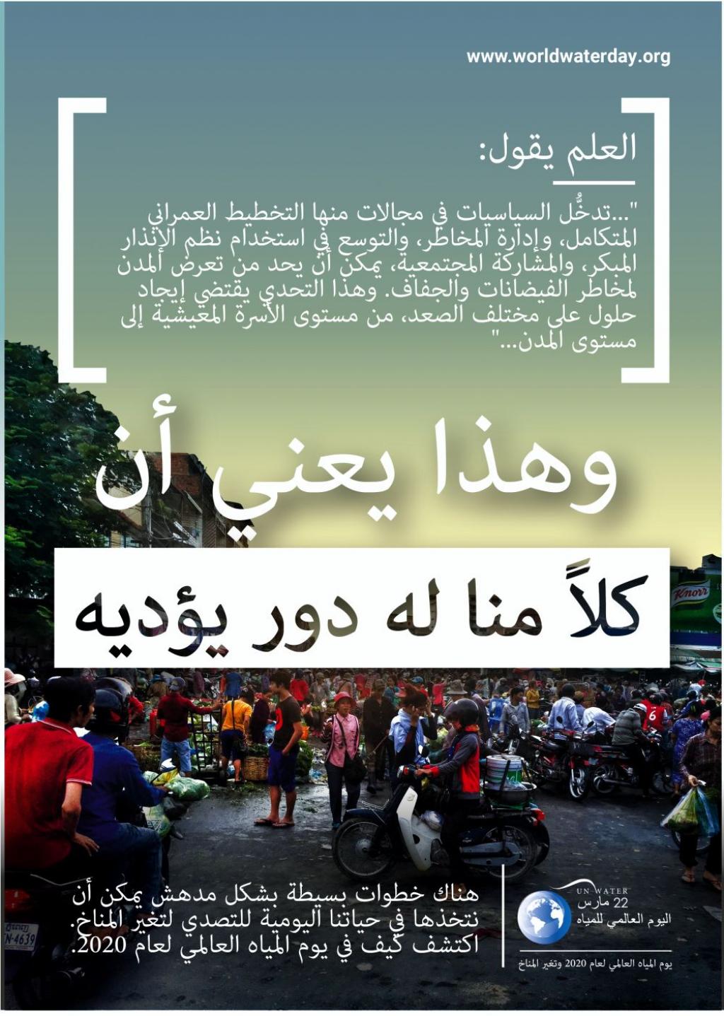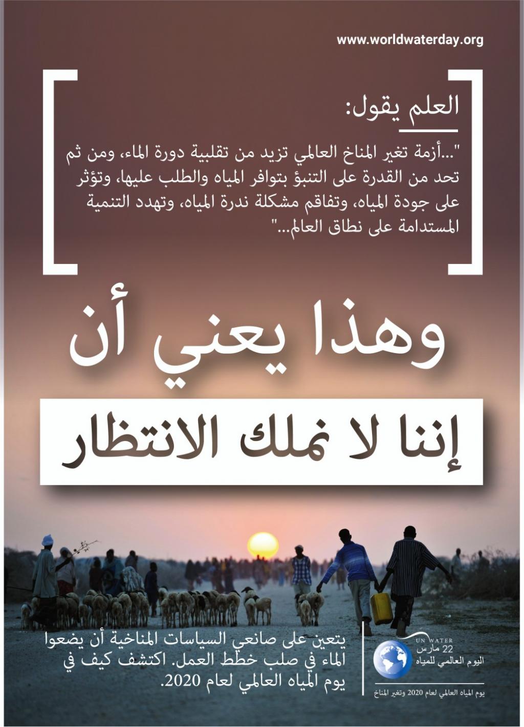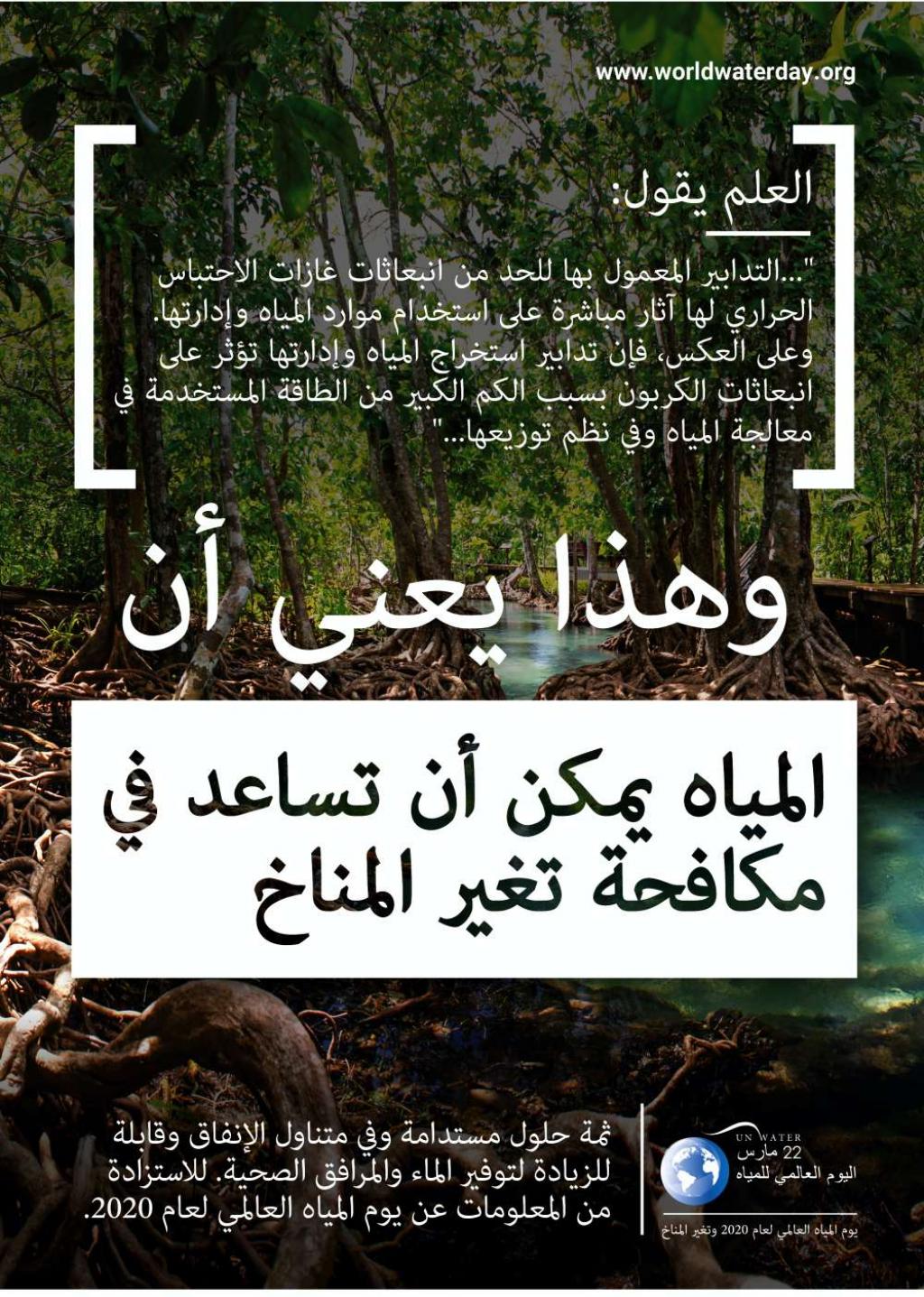 2020هو ’’ المياه وتغير المناخ ‘‘، للتوعية بترابط المسألتين ارتباطا وثيقا. وإبراز أن استخدام المياه يساعد في خفض الفيضانات والجفاف والندرة والتلوث، فضلا عن أنه يساعد في مسائل تغير المناخ ذاتها.