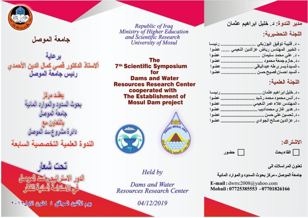 نود اعلامكم بانه قد تم تاجيل موعد انعقاد الندوة العلمية التخصصية السابعة لمركز بحوث السدود والموارد المائية تحت شعار “الدور الاستراتيجي لسد الموصل في الاستدامة المائية للقطر” الى يوم الاثنين الموافق 4 كانون الاول/2019 بدلا من يومالاثنين الموافق 25 تشرين الثاني، بناءً على توجيهات قسم الأعلام في رئاسة الجامعة لتفادي التداخل في مواعيد انعقاد المؤتمرات والندوات في الجامعة.
