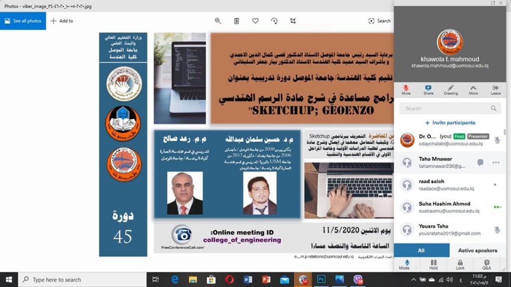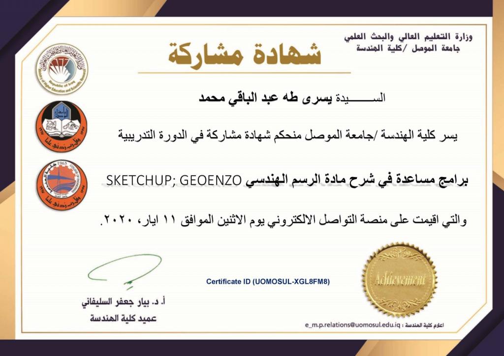 شاركت السيدة ” يسرى طه عبدالباقي الافندي” التدريسية والباحثة في قسم الموارد المائية في مركز بحوث السدود والموارد المائية – جامعة الموصل في الدورة التدريبية الالكترونية التي اقامتها كلية الهندسة في جامعة الموصل الموسومة (برامج مساعدة في شرح مادة الرسم الهندسي) تقديم م. د. حسين سلمان عبد الله وم. م. رعد صالح سلطان وذلك في تمام الساعة 9:30 مساء من يوم الاثنين الموافق 11/5/2020 وباستخدام البرنامج التفاعلي FCC.