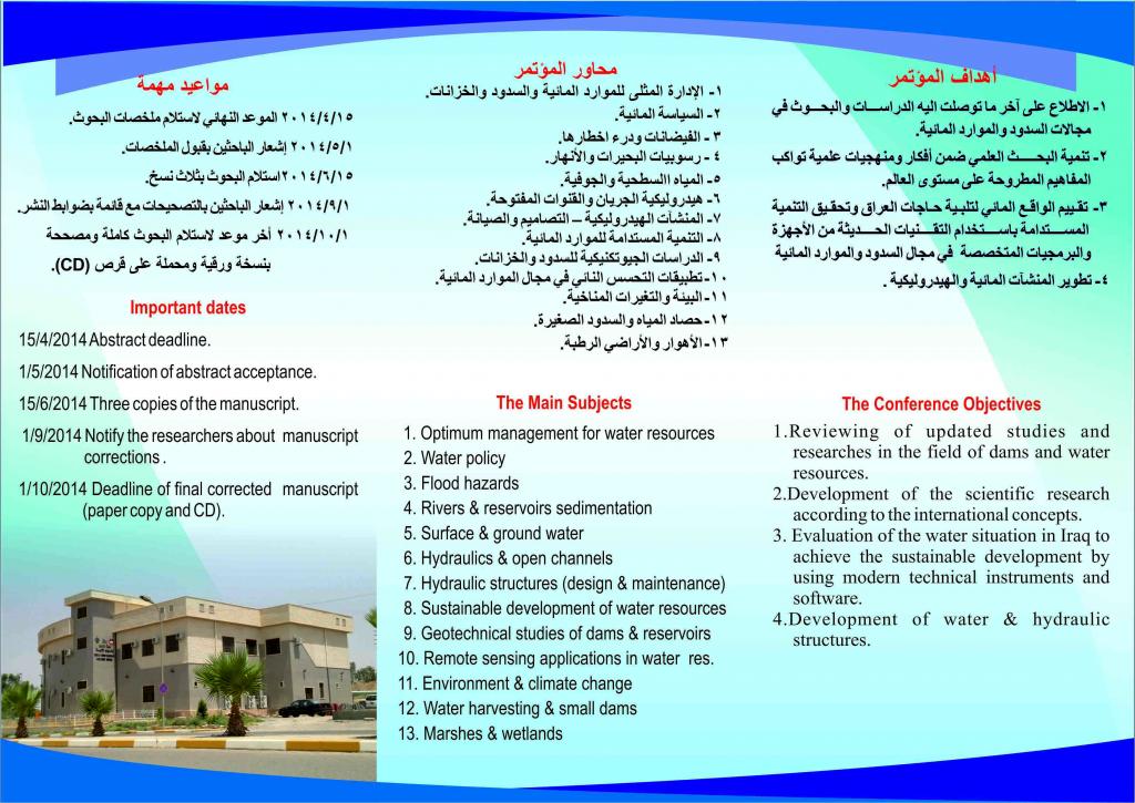 برعاية معالي وزير التعليم العالي والبحث العلمي الاستاذ علي محمد الحسين الاديب سيعقد مركز بحوث السدود والموارد المائية/ جامعة الموصل المؤتمر الوطني لبحوث السدود والموارد المائية تحت شعار (دور الدراسات الهيدرولوجية والجيوتكنيكية في مشاريع السدود والموارد المائية) للمدة 26-27/11/2014مواعيد مهمة2014/4/15 الموعد النهائي لاستلام ملخصات البحوث.2014/5/1 إشعار الباحثين بقبول الملخصات.2014/6/15استلام البحوث بثلاث نسخ.2014/9/1 إشعار الباحثين بالتصحيحات مع قائمة بضوابط النشر.2014/10/1 أخر موعد لاستلام البحوث كاملة ومصححة بنسخة ورقية ومحملة على قرص (CD).محاور المؤتمرالإدارة المثلى للموارد المائية والسدود والخزانات -السياسة المائية -الفيضانات ودرء اخطارها -رسوبيات البحيرات والأنهار -المياه االسطحية والجوفية -هيدروليكية الجريان والقنوات المفتوحة -المنشآت الهيدروليكية – التصاميم والصيانة -التنمية المستدامة للموارد المائية -الدراسات الجيوتكنيكية للسدود والخزانات -تطبيقات التحسس النائي في مجال الموارد المائية -البيئة والتغيرات المناخية -حصاد المياه والسدود الصغيرة -الأهوار والأراضي الرطبة -أهداف المؤتمرالاطلاع على آخر ما توصلت اليه الدراسات والبحوث في مجالات السدود والموارد المائية -تنمية البحث العلمي ضمن أفكار ومنهجيات علمية تواكب المفاهيم المطروحة على مستوى العالم — تقييم الواقع المائي لتلبية حاجات العراق وتحقيق التنمية المستدامة باستخدام التقنيات الحديثة من الأجهزة والبرمجيات المتخصصة في مجال السدود والموارد المائيةتطوير المنشآت المائية والهيدروليكية -ترسل الملخصات والبحوث على البريد الالكترونيE-mail : [email protected] [email protected] [email protected] : 07481705871• سيتحمل المؤتمر مبيت الباحثين فقط من خارج المحافظة ولمدة يومين في فندق نينوى الدولي