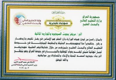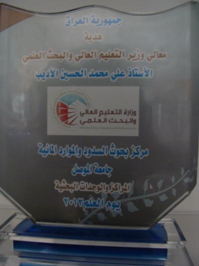 تثمينا للعطاء الثر والمنجزات الابداعية التي قدمها مركز بحوث السدود والموارد المائية في المجال العلمي والعملي، واعترافا من وزارة التعليم العالي والبحث العلمي بدوره الفعال في تطوير المنظومة العلمية في عراقنا الغالي ودفعه الى حيث التميز والابداع والرصانة عالية المستوى، وتحت شعار (بالعلم والعلماء نبني العراق)، كرم السيد معالي وزير التعليم العالي والبحث العلمي الاستاذ علي الاديب المحترم بدرع الوزارة وشهادة تقديرية كأفضل المراكز البحثية في الجامعات العراقية استنادا الى الانجازات والنتاجات العلمية (البحوث المنشورة، براءات الاختراع، المؤتمرات والندوات، الاصدارات العلمية وغيرها).
