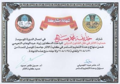 شارك السيد حذيفة محمد صالح الموظف في مركز بحوث السدود والموارد المائية بالدورة الموسومة (حماية الاثار في ظل القانون الدولي) والتي اقامتها وحدة التعليم المستمر في كلية الاثار/ جامعة الموصل للمدة 21-25/01/2018