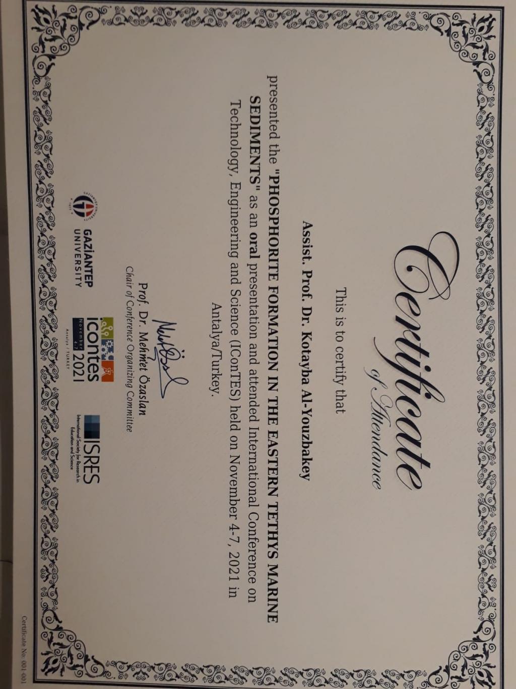 شارك أ.م.د. قتيبة توفيق اليوزبكي بالمؤتمر الدولي الذي نظمتهInternational Society for Researches in Education and SciencesبعنوانInternational Conferece in Technology, Engineering and Sciencesللفترة من 4-7 تشرين الثاني في مدينة انطاليا في تركيا. والقى د. قتيبة بحثه الموسومPhosphorite Formation in Eastern Tethys Marine Sedimentsفي الجلسة الاولى للمؤتمر الذي شاركت به عدة دول عربية واجنبية بلغت 15 دولة وبدعم عدة جامعات ومنظمات علمية وعلى راسها جامعة غازي عنتاب