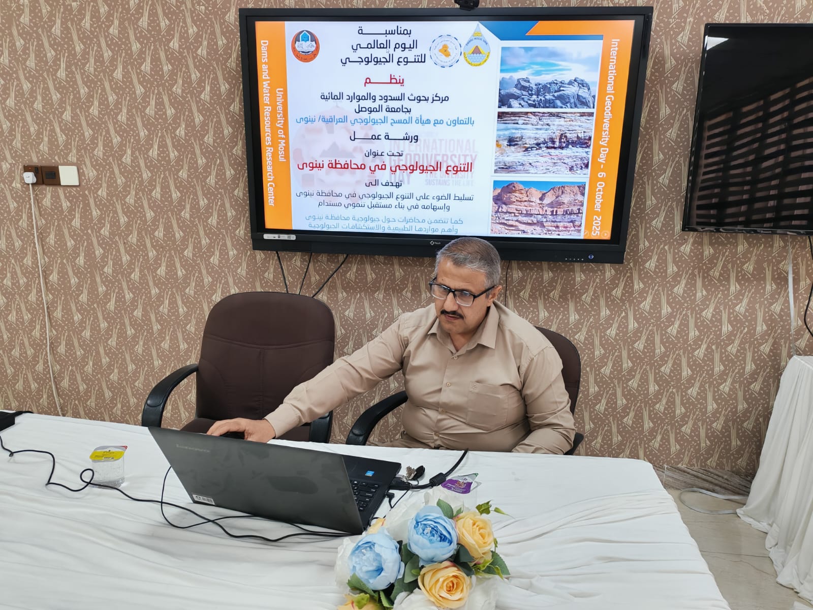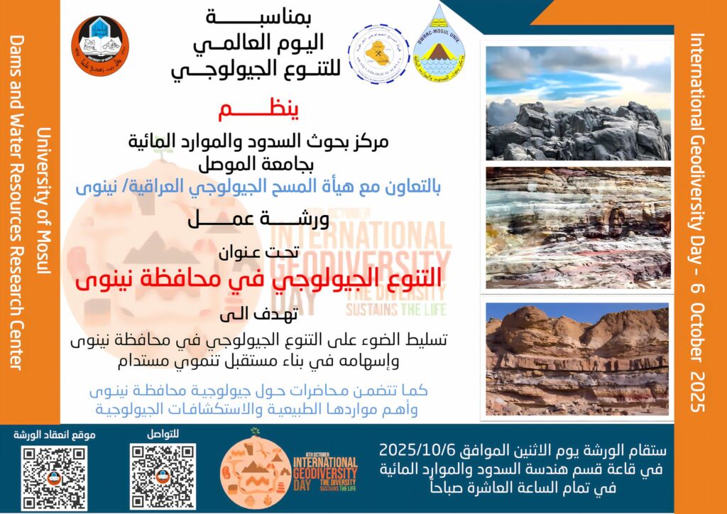 نظم مركز بحوث السدود والموارد المائية بالتعاون مع هيأة المسح الجيولوجي العراقية/ مكتب نينوى ورشة عمل بعنوان “التنوع الجيولوجي في محافظة نينوى”، وذلك يوم الاثنين 6 تشرين الأول 2025 في قاعة قسم هندسة السدود والموارد المائية بالجامعة. تأتي الورشة ضمن فعاليات اليوم العالمي للتنوع الجيولوجي، وهدفت إلى تسليط الضوء على التنوع الجيولوجي في محافظة نينوى وأهميته في تعزيز التنمية المستدامة ودعم الاقتصاد الوطني.