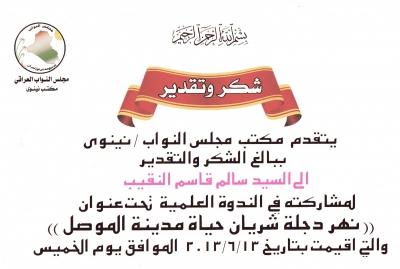 كرم السيد عضو مجلس النواب العراقي فارس السنجري الاستاذ سالم قاسم النقيب (مدير مركز بحوث السدود والموارد المائية) بدرع وشهادة تقديرية لجهوده المبذولة في انجاح اعمال الندوة العلمية (نهر دجلة شريان حياة مدينة الموصل) من خلال المشاركة بالبحثيين (تقييم تأثير السدود على نوعية مياه نهر دجلة في مدينة الموصل) و (دراسة هيدرولوجية – جيولوجية لإمكانية انشاء سد على نهر الزاب الاعلى في منطقة الكوير) والتي اقيمت برعاية مكتب مجلس النواب العراقي في محافظة نينوى وبالتعاون مع مركز بحوث السدود والموارد المائية في جامعة الموصل يوم الخميس الموافق 13/06/2013 وعلى قاعة النادي الاجتماعي.