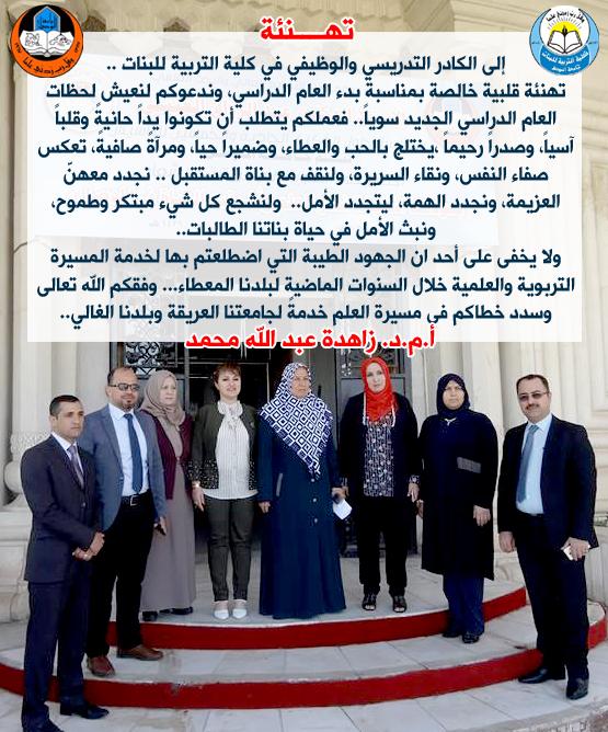 إلى الكادر التدريسي والوظيفي في كلية التربية للبنات ..تهنئة قلبية خالصة بمناسبة بدء العام الدراسي، وندعوكم لنعيش لحظات العام الدراسي الجديد سوياً.. فعملكم يتطلب أن تكونوا يداً حانيةً وقلباً آسياً، وصدراً رحيماً ،يختلج بالحب والعطاء، وضميراً حياً، ومرآةً صافيةً، تعكس صفاء النفس، ونقاء السريرة، ولنقف مع بناة المستقبل .. نجدد معهنَّ العزيمة، ونجدد الهمة، ليتجدد الأمل.. ولنشجع كل شيء مبتكر وطموح، ونبث الأمل في حياة بناتنا الطالبات..ولا يخفى على أحد ان الجهود الطيبة التي اضطلعتم بها لخدمة المسيرة التربوية والعلمية خلال السنوات الماضية لبلدنا المعطاء… وفقكم الله تعالى وسدد خطاكم في مسيرة العلم خدمةً لجامعتنا العريقة وبلدنا الغالي..آ.م.د. زاهدة عبد الله محمدعميد كلية التربية للبنات