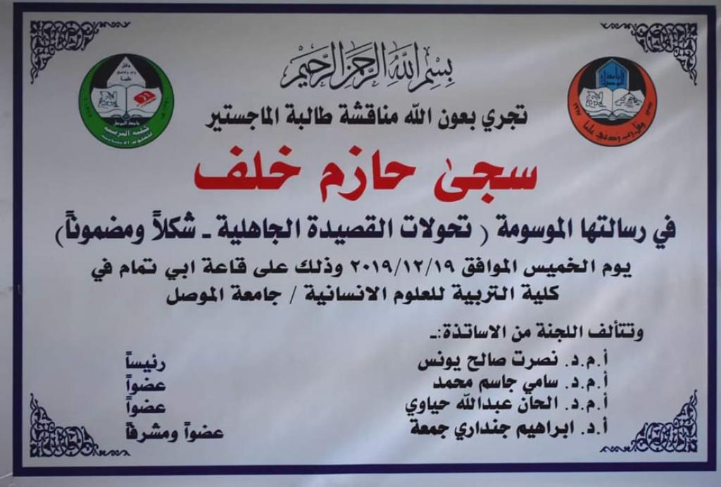 شاركت الاستاذ المساعد الدكتورة ألحان عبدالله محمد التدريسية في قسم اللغة العربية بمناقشة الطالبة سجى حازم خلف من قسم اللغة العربية / كلية التربية للعلوم الانسانية في رسالة الماجستير الموسومة بـ “تحولات القصيدة الجاهلية شكلا ومضمونا”، وذلك يوم الخميس الموافق 19 كانون الاول 2019، واجزيت الرسالة بدرجة مستوف.