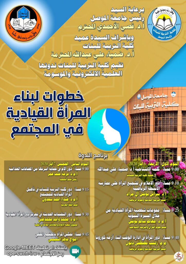 ا.م.د. داود حبو محمد/ تحليلية ، م.د. اكرم نوري محمد/ عضوية، م.د. أحمد مظفر محمد/ لاعضوية وذلك من اجل توجيه الطالبات وابلاغهن بأخر المستجدات والتعليمات حول ضرورة متابعة وحضور المحاضرات الالكترونية والتواصل مع التدريسين مبينةً لهن اهمية برامج التواصل الالكتروني وتحديداً الصف الالكتروني Google Classroom ، ومنصة البث المباشر Google meet ،، كان هنالك تفاعل من قبل الطالبات وأبدوا شُكْرُهُنَ وتقدِيرَهُنَ للسيدة رئيس القسم والاساتذة المتواصلين معهم ببرامج التعليم الإلكترونية،، كما قدموا بعض المعوقات من اجل الوقوف عليها والعمل على حلها،، كما وعدوا السيدة رئيس القسم بالتواصل مع زميلاتهن الطالبات اللواتي لم يحضرن المحاضرات المباشرة وحثهن على الحضور والتفاعل مع المادة العلمية المعطاة. وبنفس السياق أبدى السادة التدريسين ارائهم وتقيميهم لصفوفهم الإلكترونية حيث لاحظوا تسجيل معظم طالبات المرحلة في الصف الالكتروني لكن تفاعل الطالبات في الصف مع الاستاذ والملتزمات بالحضور في منصة ال Google Meet والصف الالكتروني كان دون المستوى المطلوب، وجهوا السادة التدريسين الطالبات للتعامل بجدية مع الموضوع وان لا خيار للطالبات سوى الاهتمام والإلتزام بمواعيد المحاضرات وحضورها والدراسة الجادة من اجل تحقيق النجاح وتجاوز الأزمة الراهنة. في ختام الإجتماع، اكثر الطالبات الحضور عاهَدْنَ السيدة رئيس القسم والتدريسين بمواصلة ومضاعفة المشاركة مستقبلا خصوصا بعد ان تم إعلامهن بان الدرجة ستكون على الحضور والواجبات.